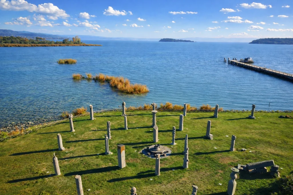 If you want one stop that feels both landscape and idea, choose Campo del Sole at Punta Navaccia. It is an open-air installation on the lakeshore: a “stone circle” of sculpted columns (each by a different artist) that reads like a contemporary, Etruscan-echoing temple rising out of water and wind. It is simple to visit, free in spirit, and surprisingly powerful at golden hour, when the lake turns the sculptures into silhouettes and the whole place becomes quiet and cinematic.