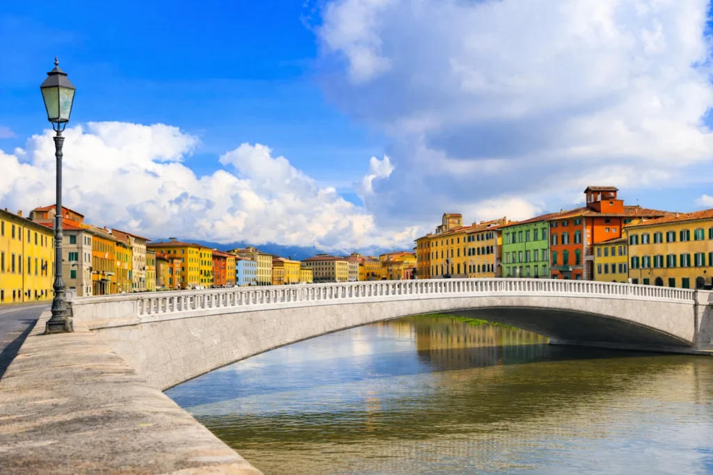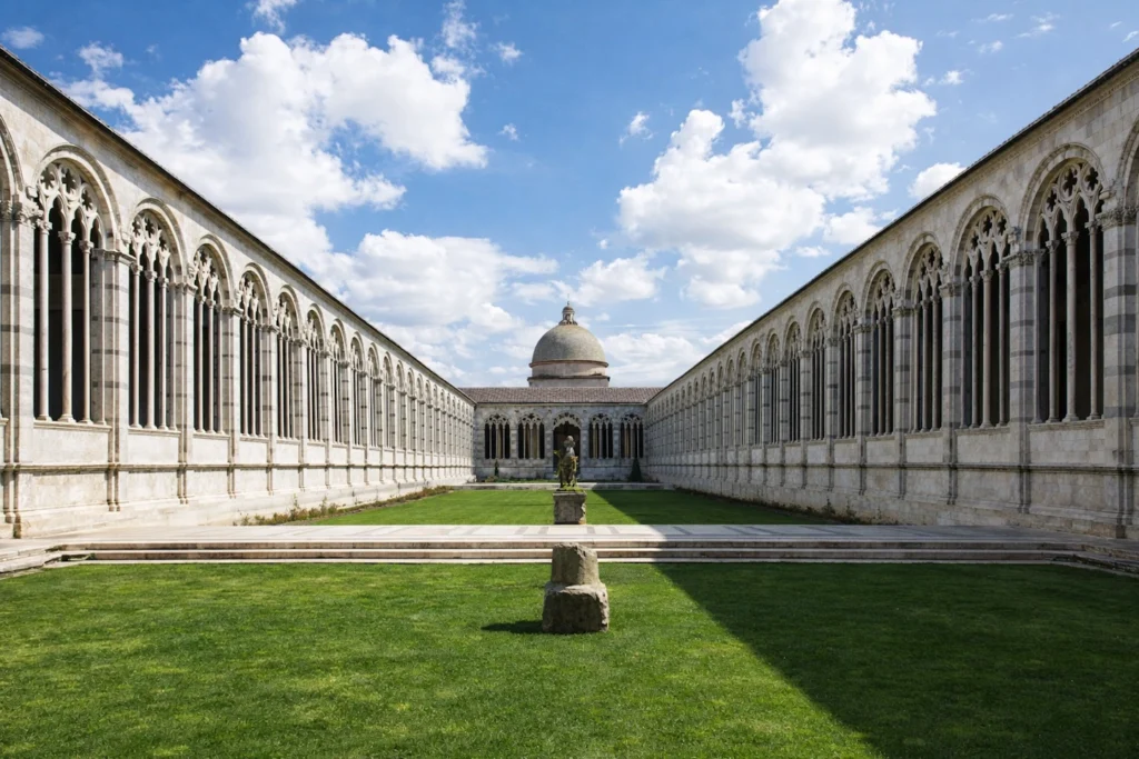 Only after that, go to the Tower. The point is not the cliché photo, it is the paradox: a bell tower intended as a clear vertical signature, made extraordinary by physics and time. Construction began in 1173, and the structure still reads as part of the same marble “sentence” as the cathedral and baptistery, not a separate attraction. If you do climb, do it for the slow reveal of the complex’s spatial logic, how the monuments sit on the grass, how the lines of sight work, how the city drops away behind the perfection of the square. To complete the Piazza, give real time to the Camposanto Monumentale and the museum spaces connected to it. The Camposanto is not simply “another building”, it is Pisa’s memory chamber, built to hold the dead and, unexpectedly, some of the most haunting painting in Tuscany. The great fresco cycles, including the famous Triumph of Death traditionally associated with Buffalmacco, turn the space into an ethical theatre, where medieval imagination becomes visible and disturbingly modern. If you care about how art is made, the sinopie and the working traces behind fresco painting are part of the story, and they make the visit feel like stepping into an atelier rather than a finished display. Then leave the Piazza and take Pisa “in the long”, along the Arno. This is where the city stops being monumental and becomes urban. Walk the Lungarni, let the light do its work, and look for the smaller, sharper notes: churches that feel like reliquaries, façades that carry the residue of a maritime republic, courtyards and galleries that appear almost by accident. If you want one museum that repays attention, choose the Museo Nazionale di San Matteo: it is the right place to read Pisa’s artistic identity beyond the Piazza, through painting, sculpture, and devotional culture across the centuries.